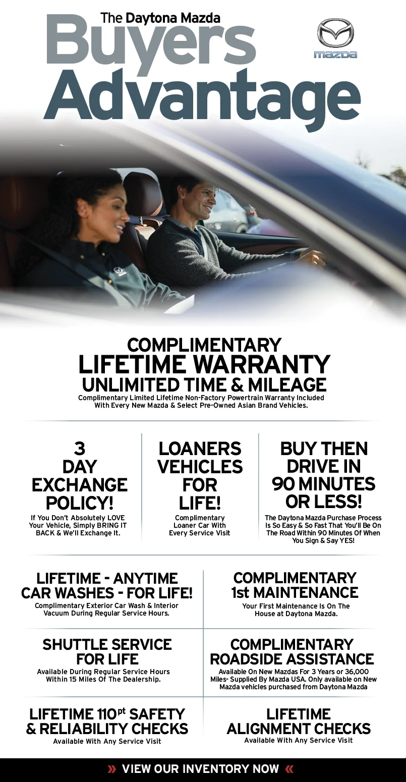 3 Day Exchange Policy: Available on New and Pre-Owned Vehicles; Vehicle must be returned within 3 business days of delivery date with no more than 300 additional miles with no alterations or damage; vehicle may be exchanged for another vehicle from dealer stock only. Maintenance includes oil change and tire rotation at the time/mileage interval recommended by Mazda for the specific purchased vehicle; see dealer for details. Car Washes are available at every service visit; includes basic exterior car wash. Loaner Cars are available on a first come, first served basis; available when your vehicle is required to be in our service department for 3 or more hours of labor; reservation of loaner car is required at time of appointment setting. Shuttle Service available during regular service hours within 15 mile radius of the dealership when vehicle is at dealership for service. Lifetime Safety Inspections & Alignment Checks are available without an appointment on a first come, first served basis. Please see dealer for additional details on any points of this program.