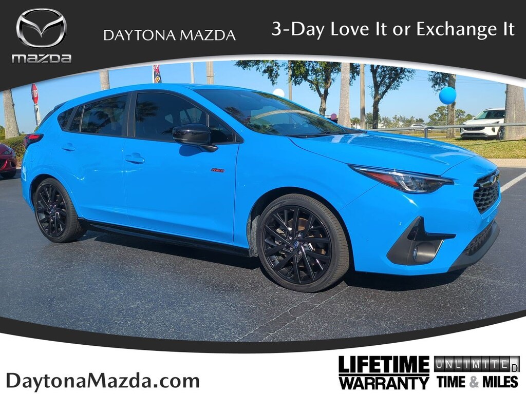 This 2024 Subaru Impreza features 4-Wheel Disc Brakes, 6 Speakers, ABS brakes, Air Conditioning, Alloy wheels, AM/FM radio: SiriusXM, Anti-whiplash front head restraints, Auto High-beam Headlights, Automatic temperature control, Brake assist, Bumpers: body-color, Driver door bin, Driver vanity mirror, Dual front impact airbags, Dual front side impact airbags, Electronic Stability Control, Emergency communication system: STARLINK Safety and Security (Subscription Required), Exterior Parking Camera Rear, Four wheel independent suspension, Front anti-roll bar, Front Bucket Seats, Front Center Armrest, Front dual zone A/C, Front fog lights, Front reading lights, Fully automatic headlights, Heated door mirrors, Heated Front Bucket Seats, Heated front seats, Illuminated entry, Knee airbag, Leather Shift Knob, Low tire pressure warning, Occupant sensing airbag, Outside temperature display, Overhead airbag, Overhead console, Panic alarm, Passenger door bin, Passenger vanity mirror, Power door mirrors, Power steering, Power windows, Radio data system, Radio: Subaru STARLINK 11.6" Multimedia Plus Sys, Rear anti-roll bar, Rear seat center armrest, Rear window defroster, Rear window wiper, Remote keyless entry, RS Cloth Upholstery, Security system, Speed control, Speed-sensing steering, Split folding rear seat, Spoiler, STARLINK/Apple CarPlay/Android Auto, Steering wheel mounted audio controls, Tachometer, Telescoping steering wheel, Tilt steering wheel, Traction control, Trip computer, Turn signal indicator mirrors, Variably intermittent wipers, and Wheels: 18" x 7.0" Dark Gray Aluminum-Alloy. *Pricing Disclaimer: All prices do not include tax, tag, e-tag fee ($389) or dealer fee ($899.50) or dealer add-ons. Pricing includes $1,000 Trade Assist and $1,000 Finance Assist and does not include reconditioning. Customer must trade-in a vehicle to receive $1,000 Trade Assist Credit. Trade Assist credit is provided by this dealership and not all trades qualify for savings. *Financing must be provided by a lender using this dealership's assistance to receive the $1,000 Finance Assist Credit. See Dealer for complete details. All of our vehicles are ASE Certified inspected so you can buy with confidence from Daytona Mazda. Proudly serving Daytona Beach, Palm Coast, Port Orange, Deland, Deltona and beyond, there are numerous reasons to choose Daytona Mazda.